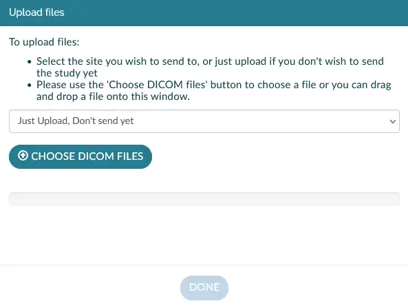 The dialog will allow you to upload files either by drag and dropping files onto the window or using the Choose DICOM Files button